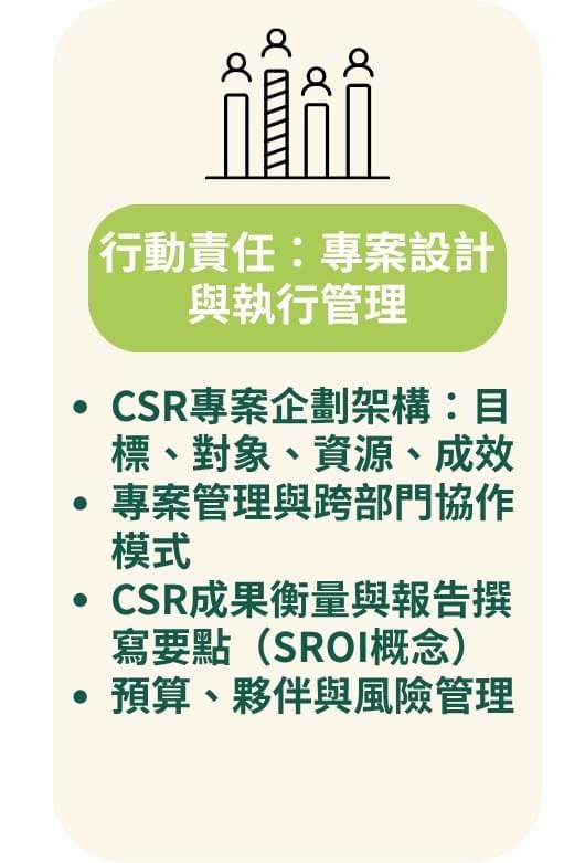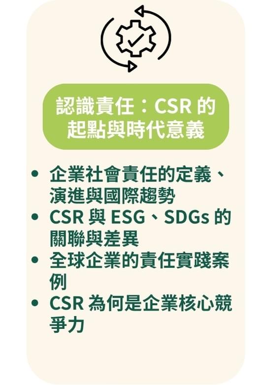 在全球永續浪潮下,企業不再只是追求營利的經濟體,而是社會價值的實踐者。《社會責任系列課程》將帶領學員深入理解 企業社會責任(CSR) 與 永續發展目標(SDGs) 的核心精神,從理念、策略到行動,學會如何把社會責任融入品牌、文化與日常經營中,實踐「讓企業更好,也讓世界更好」的真義。